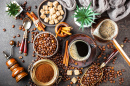 Tisch mit Kaffeebohnen, Trockenfrüchten und Zimt